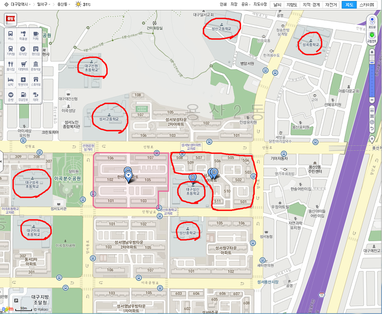 성산초중학교, 성산중학교, 성서고등학교 인접,